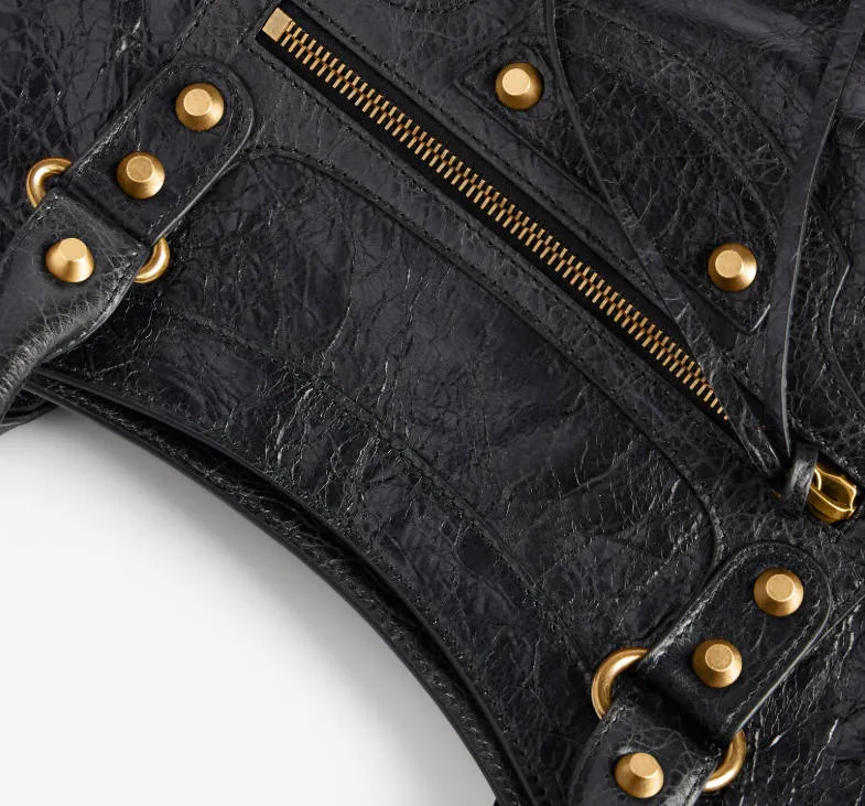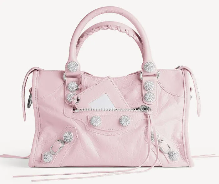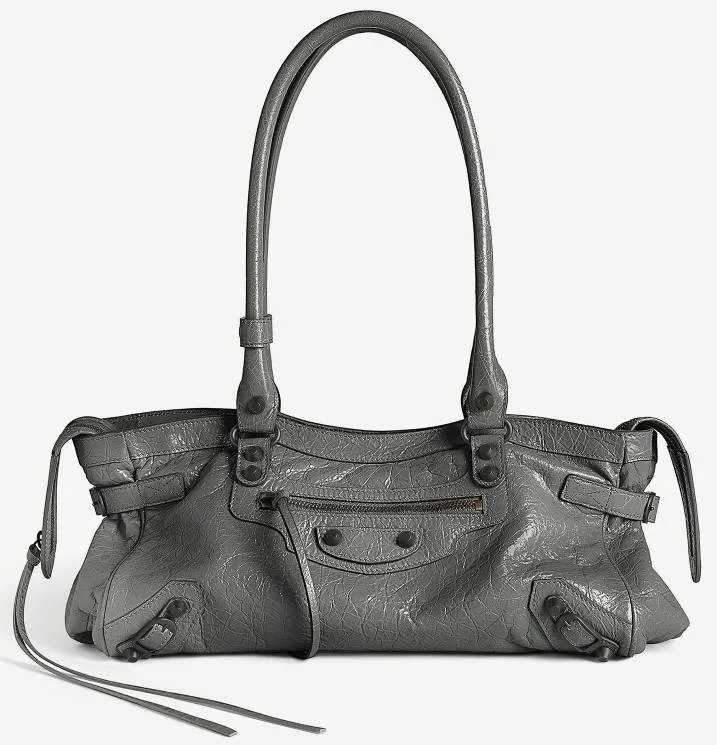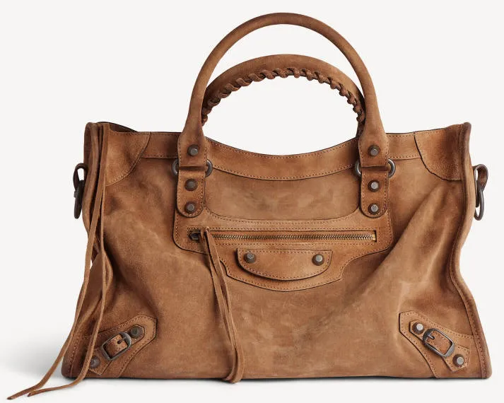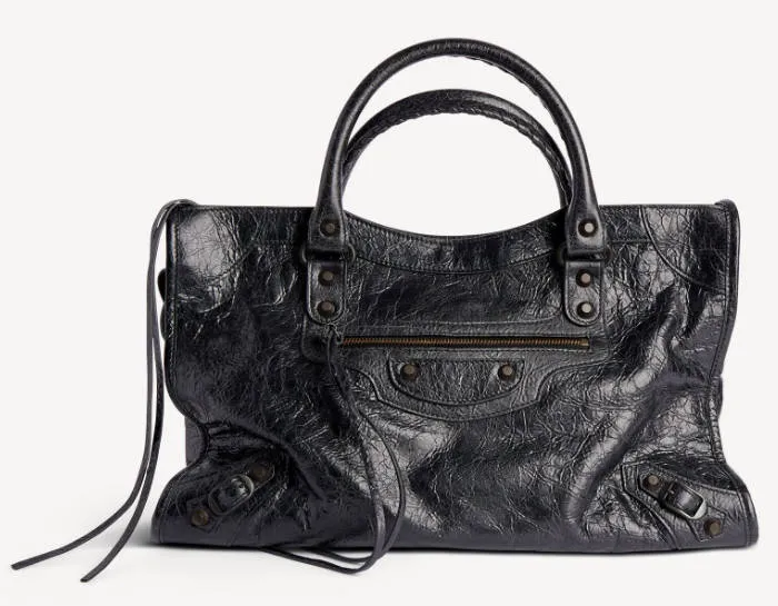 The City bag is known for its motorcycle-inspired hardware, including buckles, studs, and zippers.