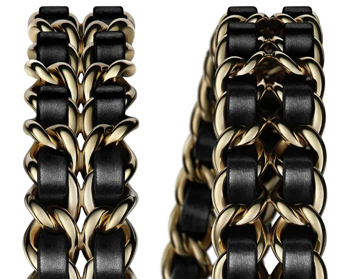 This chain-and-leather combination mirrors the strap of Chanel's iconic quilted bags, reinforcing the brand's fashion identity.